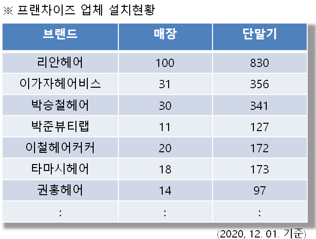 고급 프랜차이즈 헤어샵 위주로 일정규모 이상의