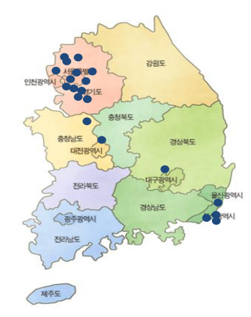 서울/경기/충청권/경상권 등에 고르게 분포되어 있기 때문에