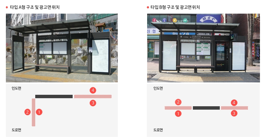 버스쉘터 당 2면 또는 4면이 배치되어 있습니다.