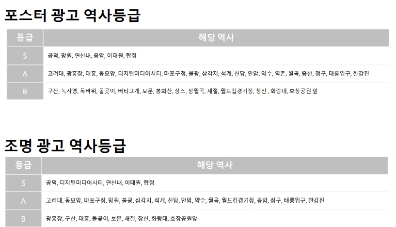 각 역사에 따라 등급이 다르게 나뉘어지며